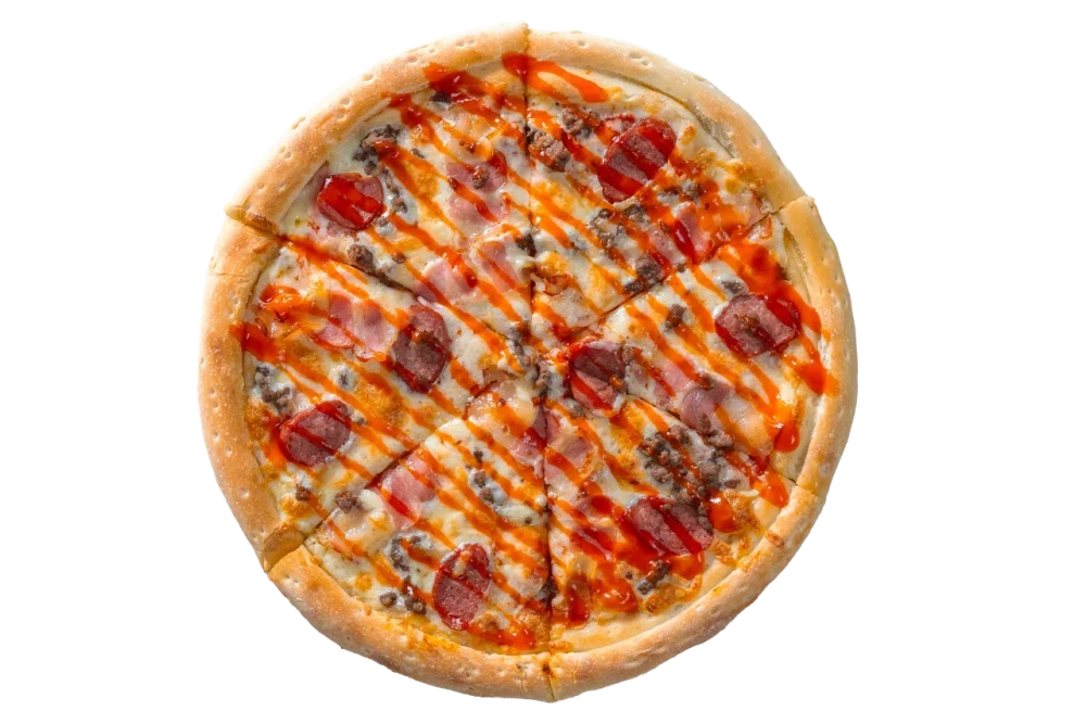 Ваша остановочка! Фирменный красный соус, вкуснейшие охотничьи колбаски, бекон, говядина, острые халапеньо, жареный лук и полито соусом шрирача. Не надо хотеть, надо брать! Пышное\тонкое тесто на выбор