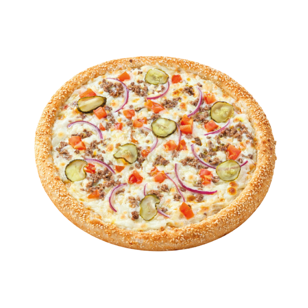 Сырный соус, сыр Моцарелла, маринованный огурчик, говядина, красный лук, томаты, кунжутный бортик.
