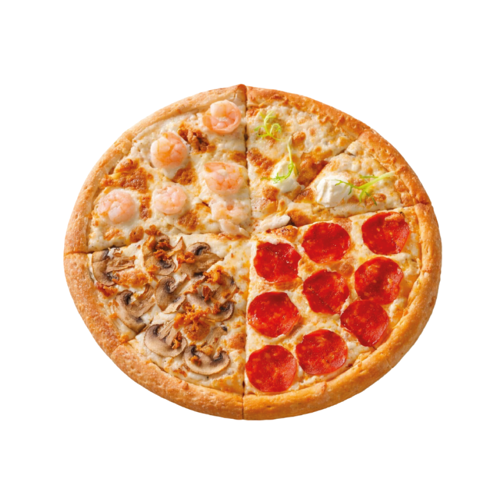 Четыре сезона премиум. Не можете определиться с выбором? Тогда это для вас! Ароматный чесночный соус, бесподобные колбаски пепперони, свежие шампиньоны, креветки, мягкий сливочный сыр и всё под сыром моцарелла. Вы точно найдете кусочек по вкусу! Пышное\тонкое тесто на выбор