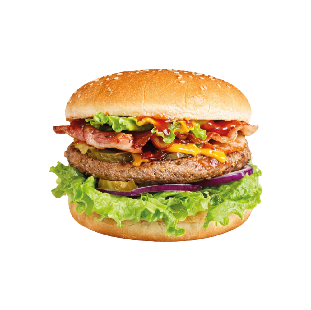 Сладкий чили соус, салат, красный лук, халапеньо, сыр чеддер, котлета, бекон. К размеру XL сырный соус и картофель фри в подарок!