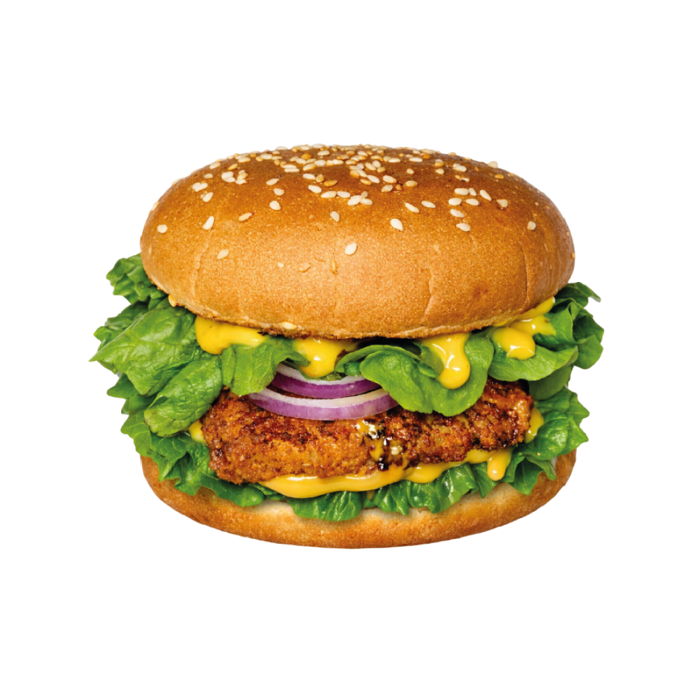 Соусы чесночный и горчичный, котлета в панировке из минтая, сыр чеддер, красный лук, болгарский перец гриль.